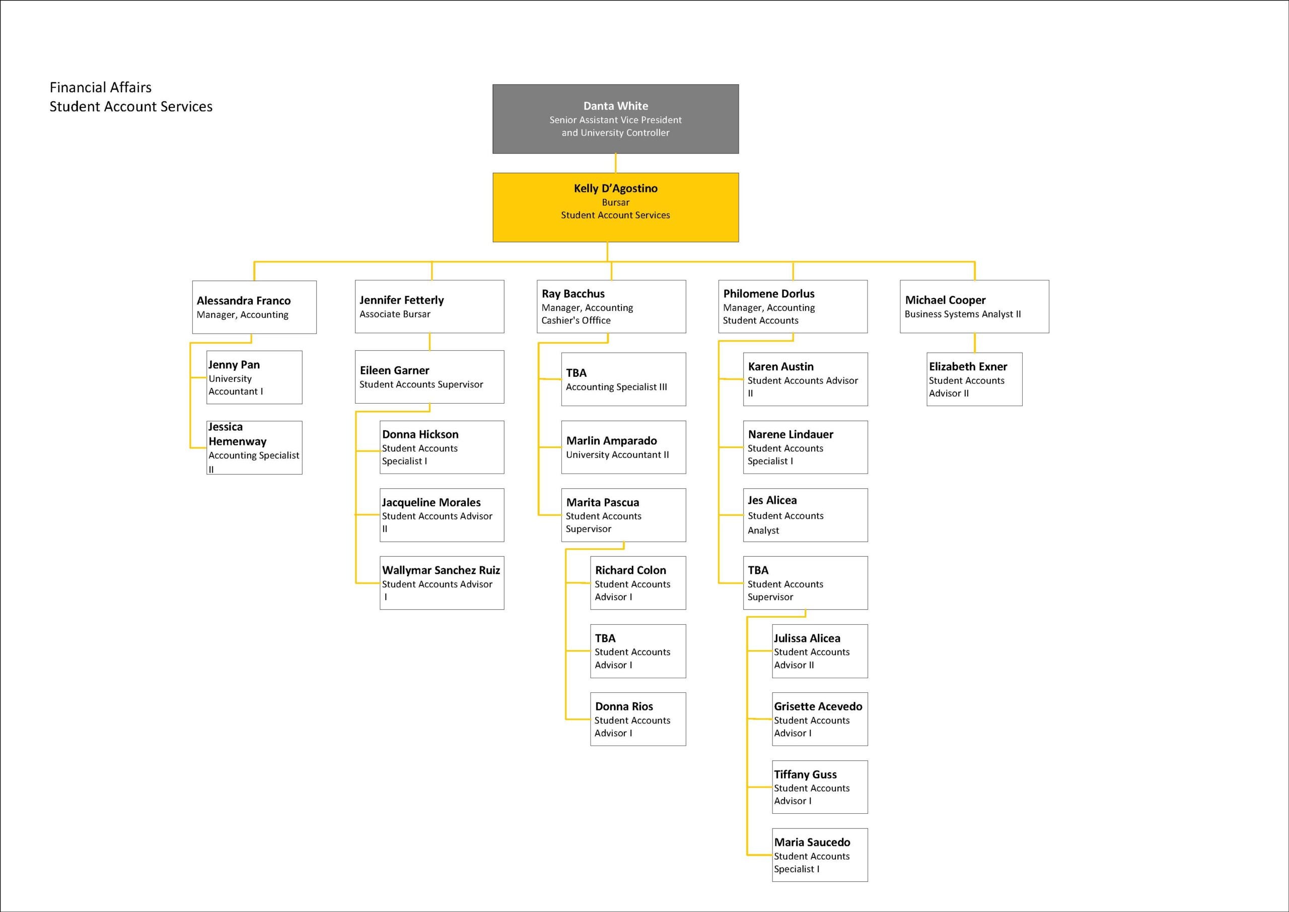 The mission of the Student Account Services office is to serve the students who attend our university by billing fees, campus housing, and other university charges accurately and efficiently, and collecting and crediting tuition revenue. We are here to provide students with quality service and information by maintaining accurate financial records and communicating policies and information to students concerning their accounts. Student Account Services is managed by the Bursar who reports to the Controller of the University. Student Account Services is a section of the Division of Finance that reports to the Vice President and Chief Financial Officer.